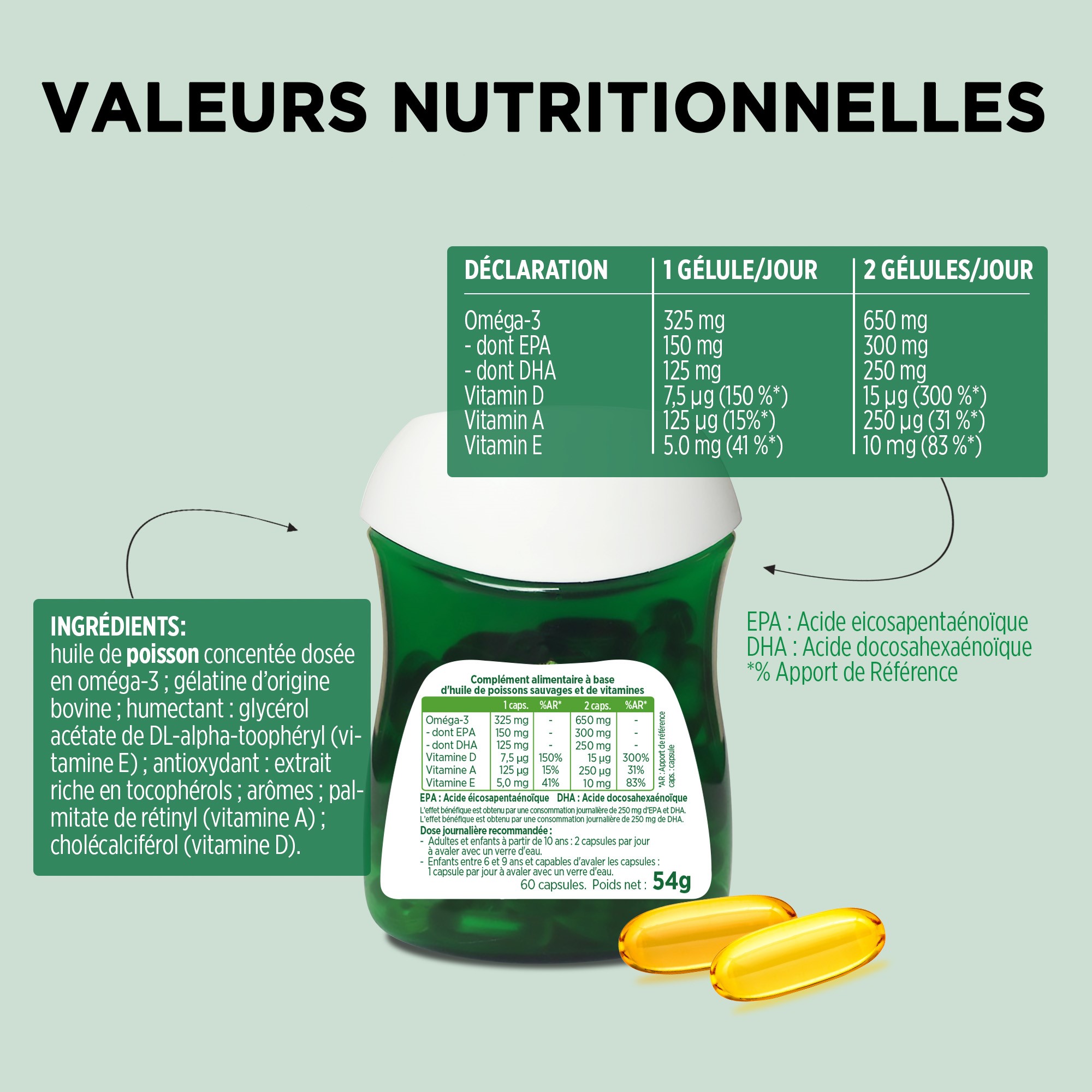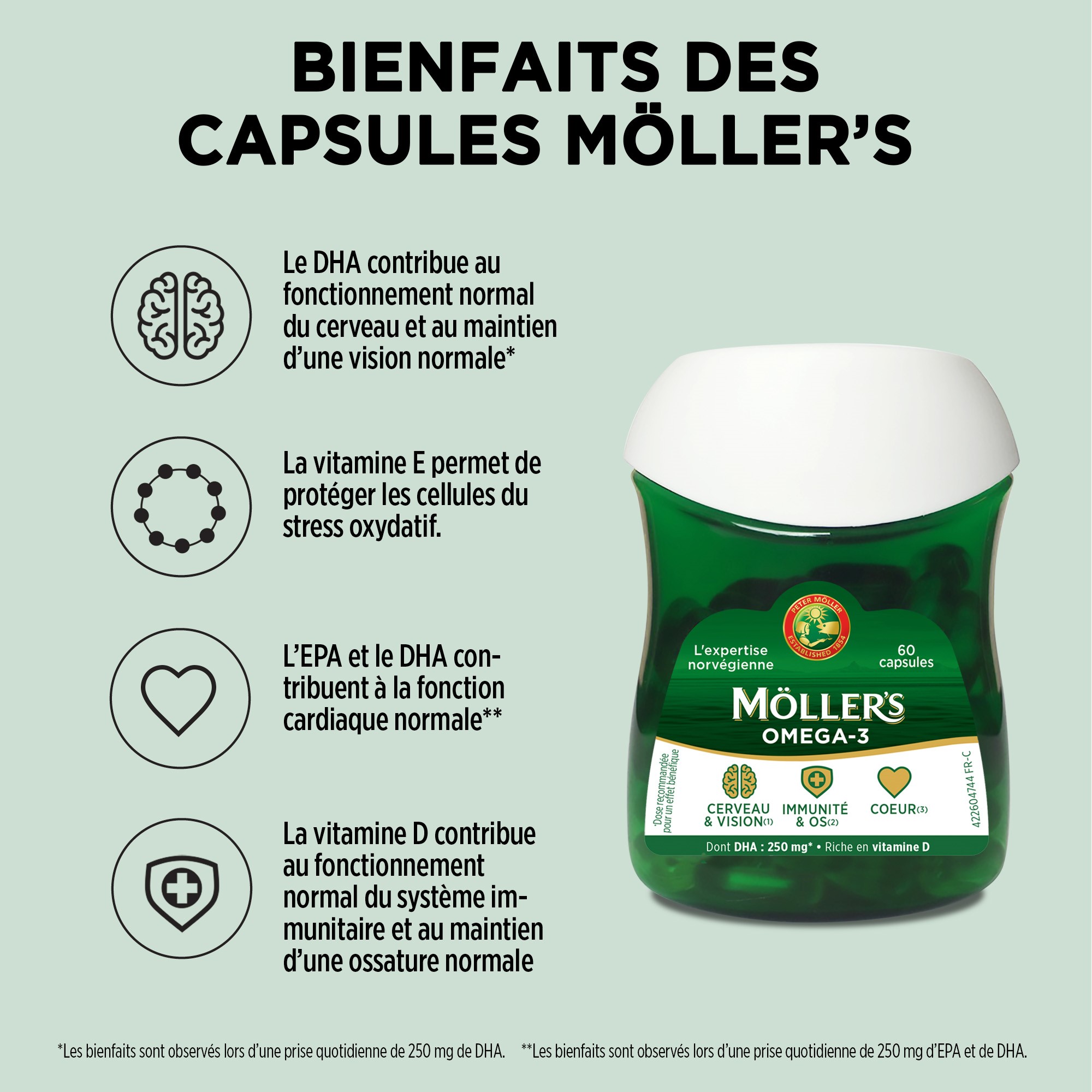 Les acides gras Oméga-3 font partie des acides gras polyinsaturés. Contrairement aux acides gras saturés, le corps ne peut pas produire ces acides gras par lui-même. Ils doivent donc être apportés par l’alimentation. Les capsules d’Oméga-3 Möller’s Double sont d’excellentes sources d’oméga-3 EPA et DHA. Riche en acides gras Oméga-3, elles apportent à votre corps les acides gras Oméga-3 essentiels DHA et EPA, qui contribuent au fonctionnement cardiaque normal*. Le DHA contribue également au fonctionnement normal du cerveau et au maintien d’une vision normale**. La vitamine A et D contribuent au maintien d’une ossature normale et au fonctionnement normal du système immunitaire. La vitamine E protège les cellules du stress oxydatif.