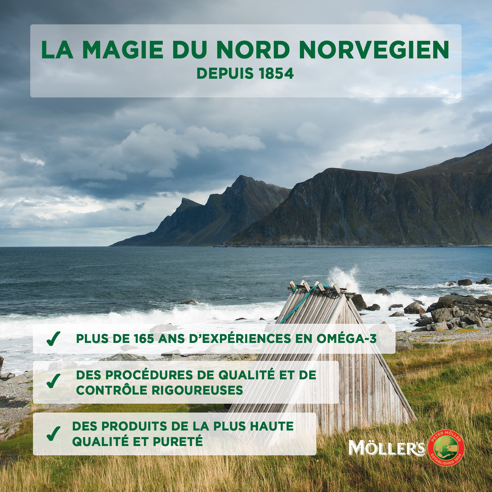 L’huile de foie de morue de Möller contient des acides gras oméga-3 naturels en combinaison avec les vitamines A, D et E.