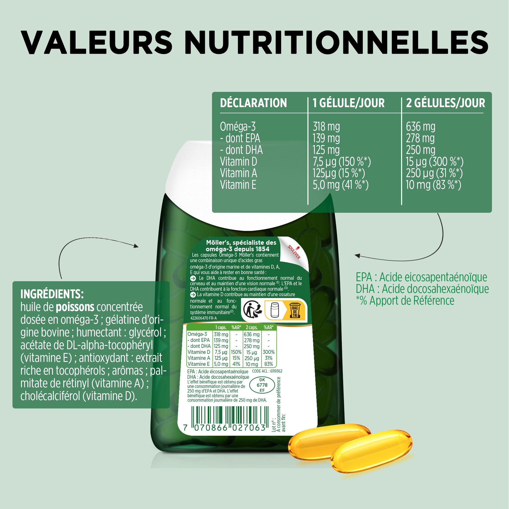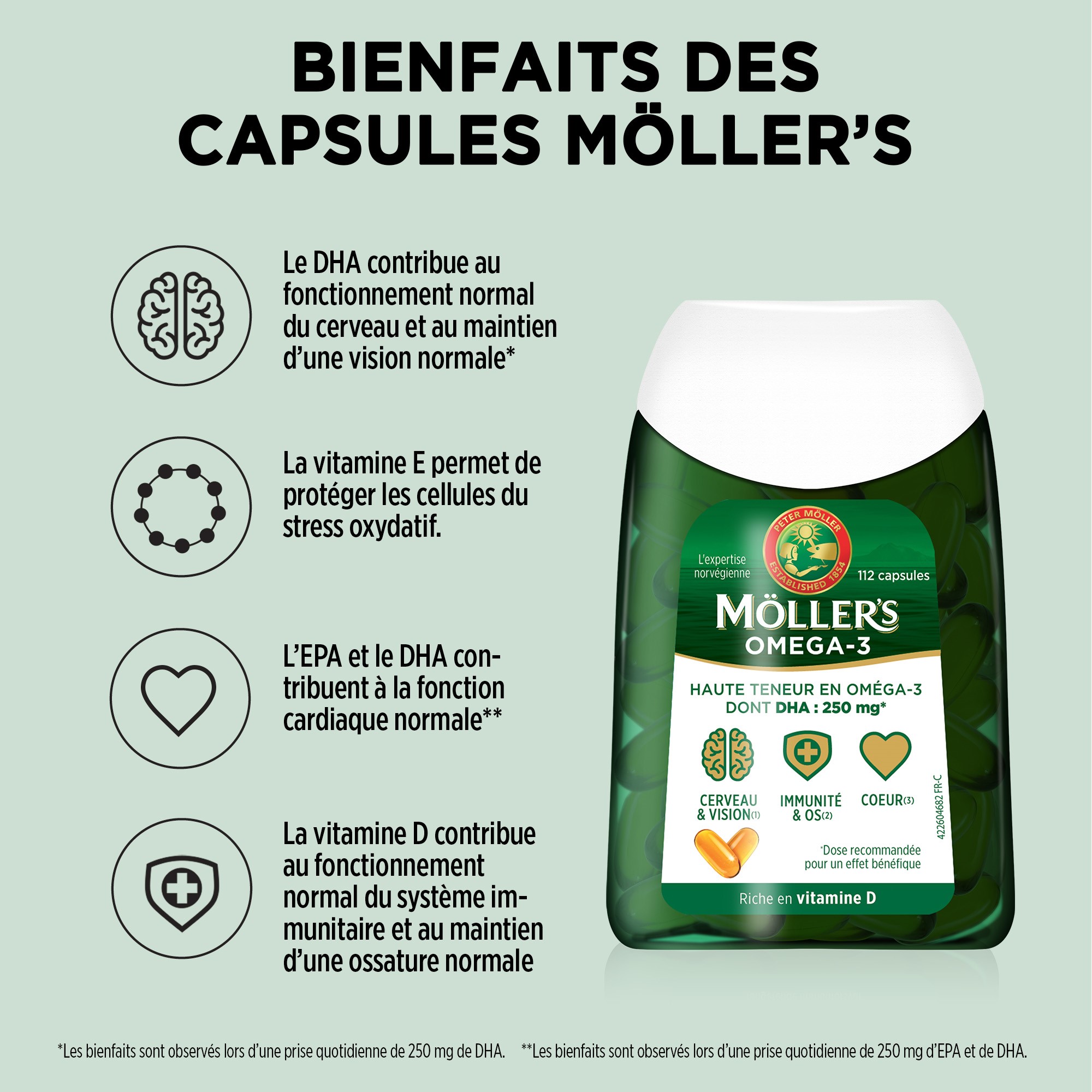 Les acides gras Oméga-3 font partie des acides gras polyinsaturés. Contrairement aux acides gras saturés, le corps ne peut pas produire ces acides gras par lui-même. Ils doivent donc être apportés par l’alimentation. Les capsules d’Oméga-3 Möller’s Double sont d’excellentes sources d’oméga-3 EPA et DHA. Riche en acides gras Oméga-3, elles apportent à votre corps les acides gras Oméga-3 essentiels DHA et EPA, qui contribuent au fonctionnement cardiaque normal*. Le DHA contribue également au fonctionnement normal du cerveau et au maintien d’une vision normale**. La vitamine A et D contribuent au maintien d’une ossature normale et au fonctionnement normal du système immunitaire. La vitamine E protège les cellules du stress oxydatif.