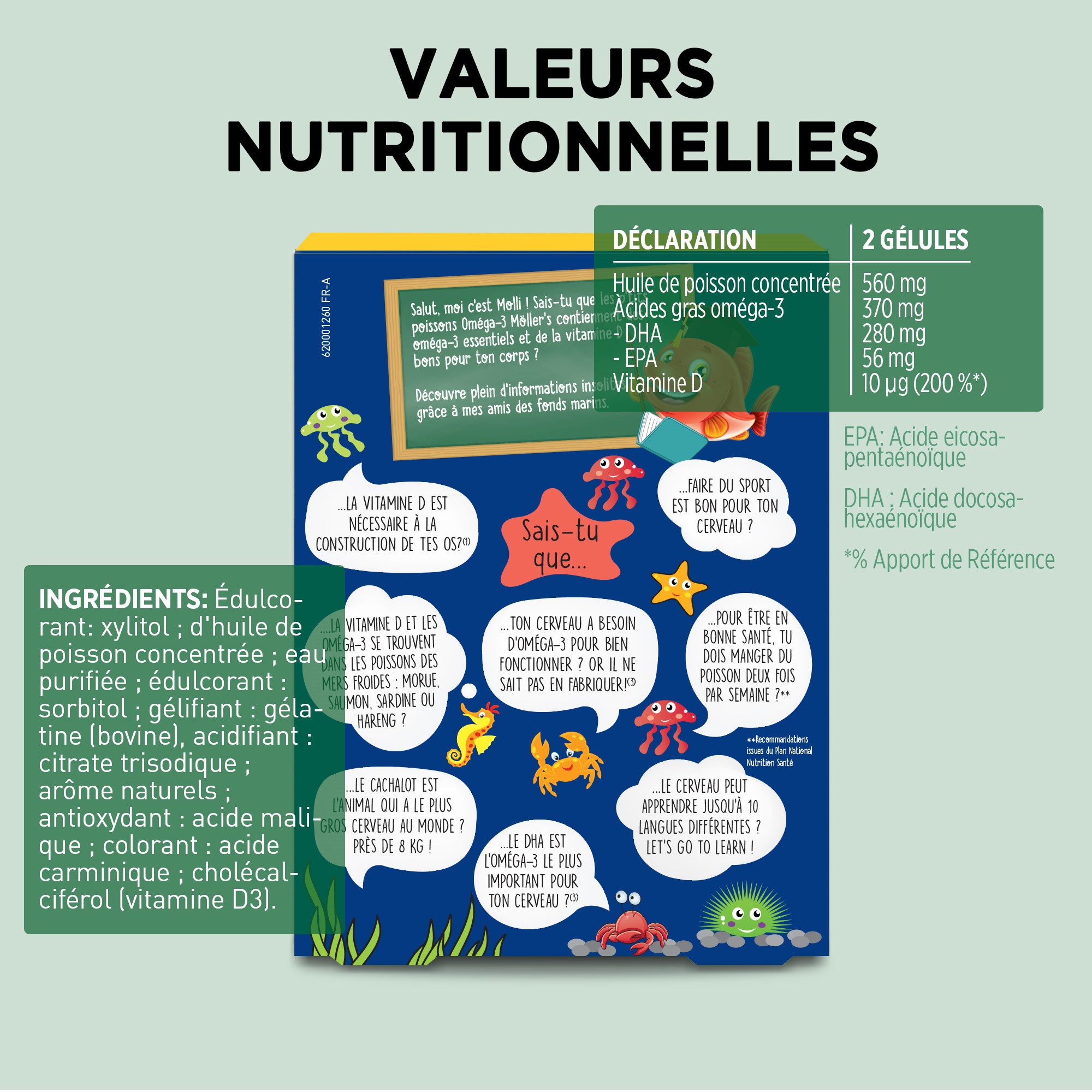 Les P’tits Poissons Möllers contiennent également du DHA, un acide gras Oméga-3 qui contribue au fonctionnement normal du cerveau et au maintien d’une vision normale. L’effet bénéfique est obtenu par la consommation journalière de 250 mg de DHA.
