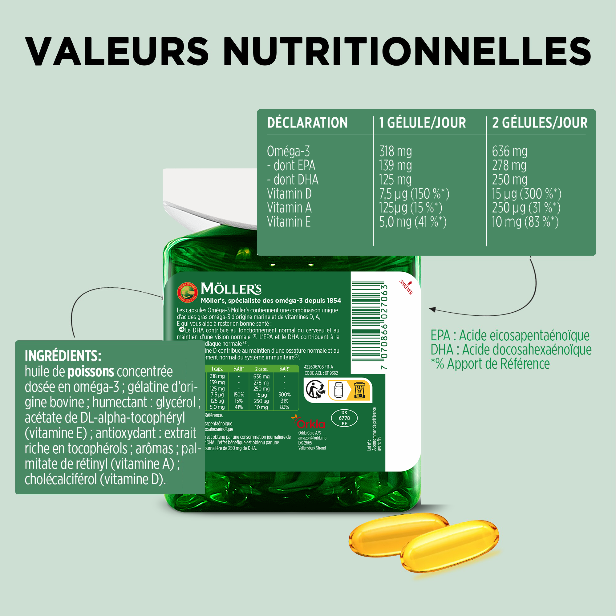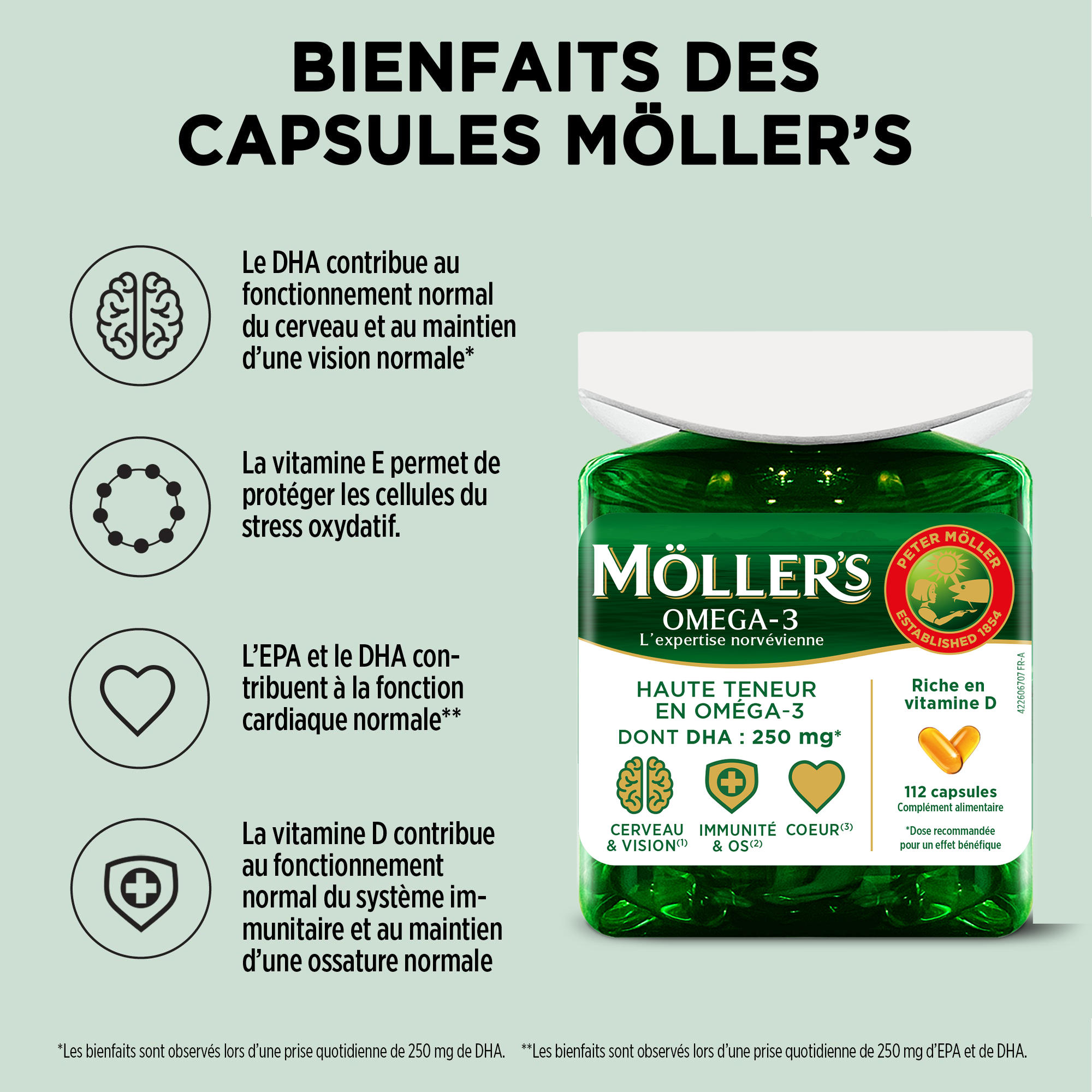 Les acides gras Oméga-3 font partie des acides gras polyinsaturés. Contrairement aux acides gras saturés, le corps ne peut pas produire ces acides gras par lui-même. Ils doivent donc être apportés par l’alimentation. Les capsules d’Oméga-3 Möller’s Double sont d’excellentes sources d’oméga-3 EPA et DHA. Riche en acides gras Oméga-3, elles apportent à votre corps les acides gras Oméga-3 essentiels DHA et EPA, qui contribuent au fonctionnement cardiaque normal*. Le DHA contribue également au fonctionnement normal du cerveau et au maintien d’une vision normale**. La vitamine A et D contribuent au maintien d’une ossature normale et au fonctionnement normal du système immunitaire. La vitamine E protège les cellules du stress oxydatif.